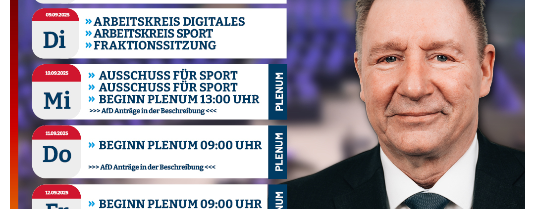 Hier ist ein kleiner Einblick über meine Termine und Anträgen unserer AfD Fraktion im Deutschen Bundestag während der aktuellen Bundestagswoche (KW37/2025).
