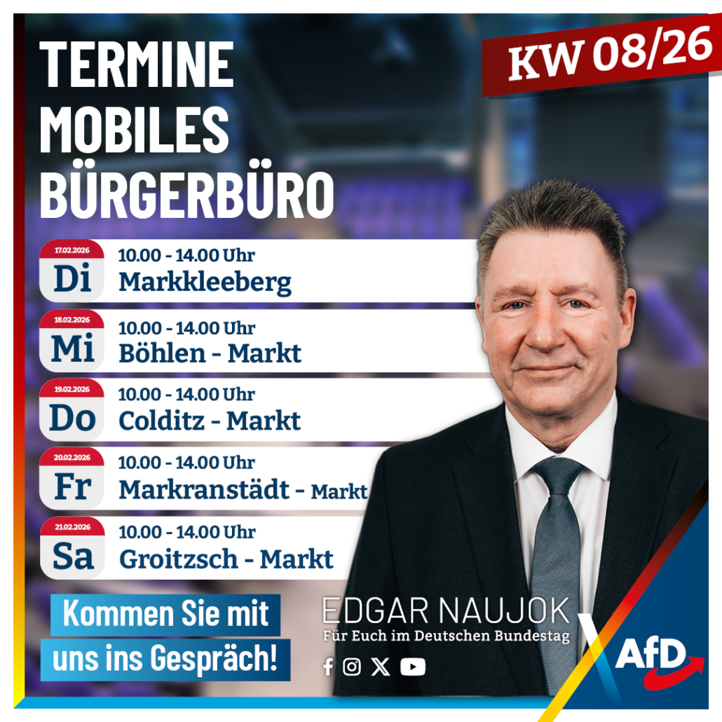 In dieser Woche ist das mobile Bürgerbüro unseres Bundestagsabgeordneten Edgar Naujok wieder in der Region unterwegs und macht Halt an verschiedenen Standorten. Vor Ort haben Bürgerinnen und Bürger die Möglichkeit, ihre Anliegen persönlich zu klären – direkt, unkompliziert und ohne lange Wege.