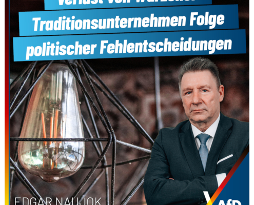 Zu der Schließung von Deutschlands ältester Leuchtenmanufaktur in Wurzen äußert sich der AfD-Bundestagsabgeordnete Edgar Naujok wie folgt: