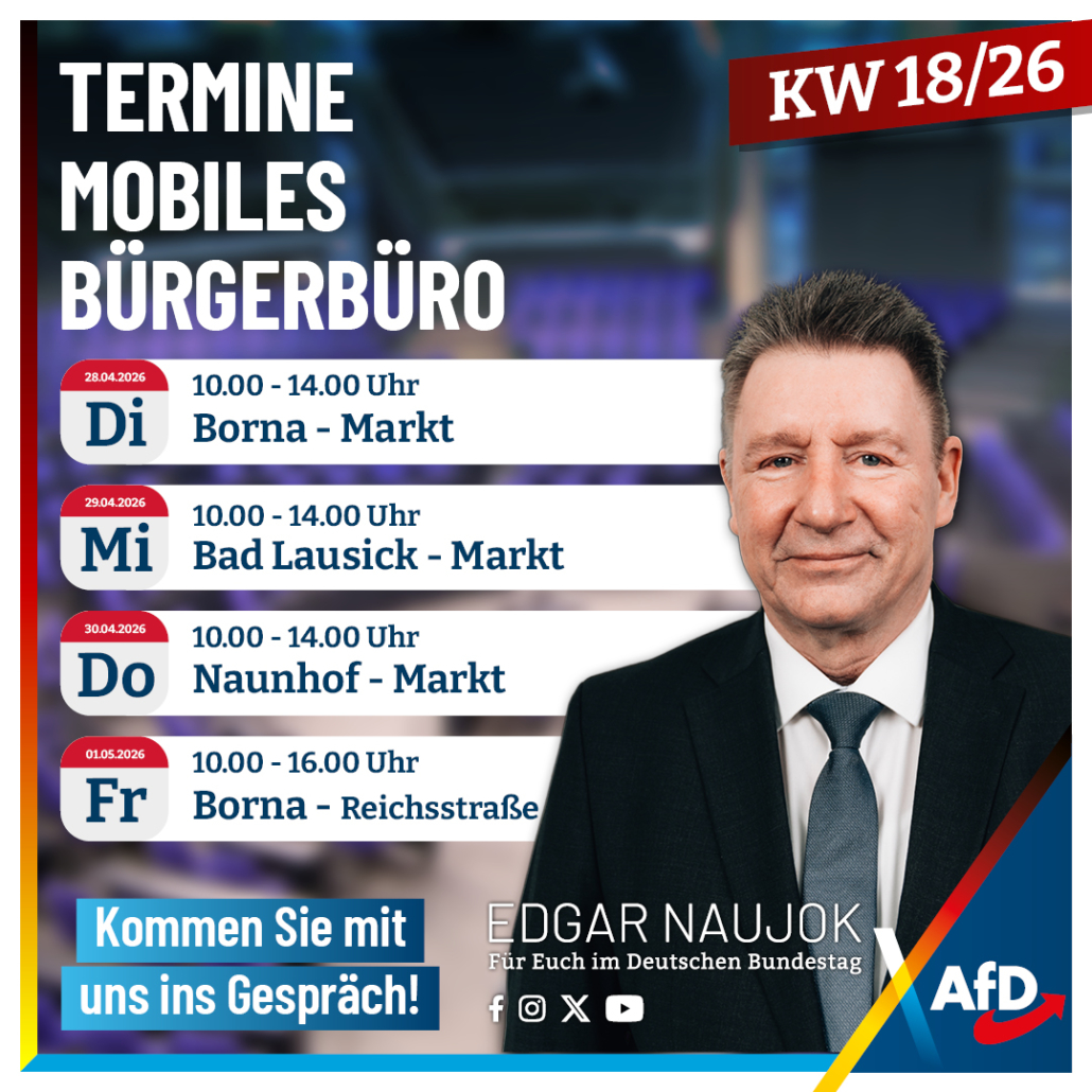 In dieser Woche ist das mobile Bürgerbüro unseres Bundestagsabgeordneten Edgar Naujok wieder in der Region unterwegs und macht Halt an verschiedenen Standorten. Vor Ort haben Bürgerinnen und Bürger die Möglichkeit, ihre Anliegen persönlich zu klären – direkt, unkompliziert und ohne lange Wege.